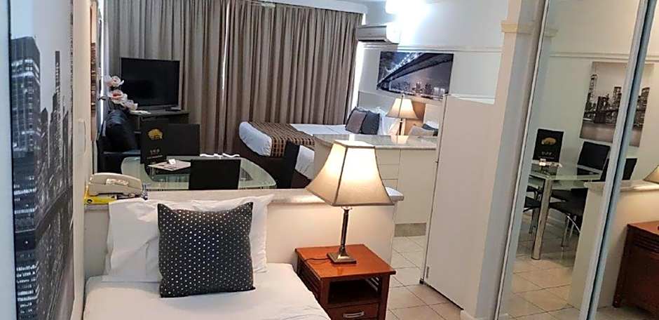 Room has a kitchenette with a microwave. Features a semi-double bed (47 in wide).